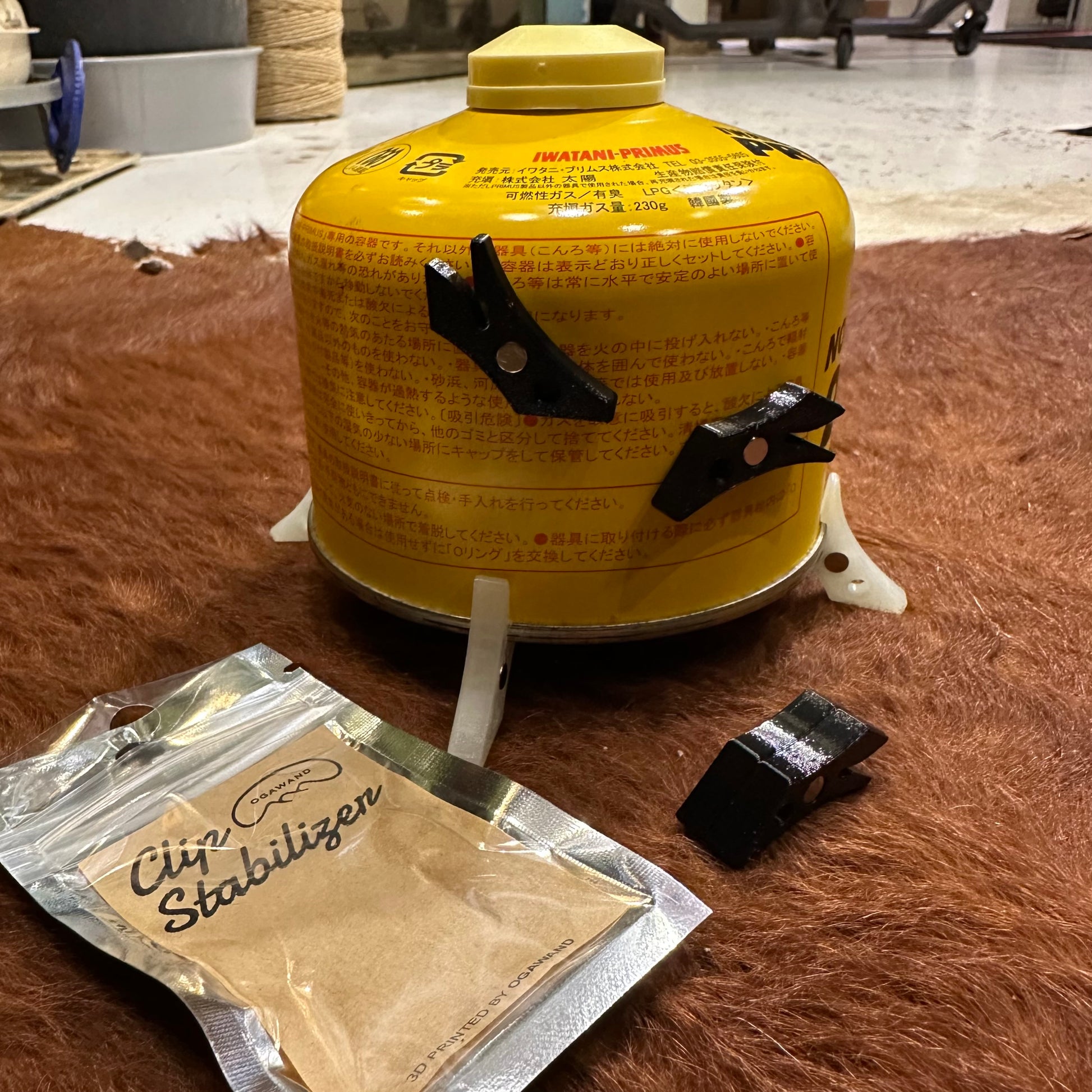 「Clip Stabilizer(クリップスタビライザー)」は、そのガスカートリッジ(ガス缶)の縁(ふち)に取り付けるだけで、フレキシブルな安定をもたらすことができる