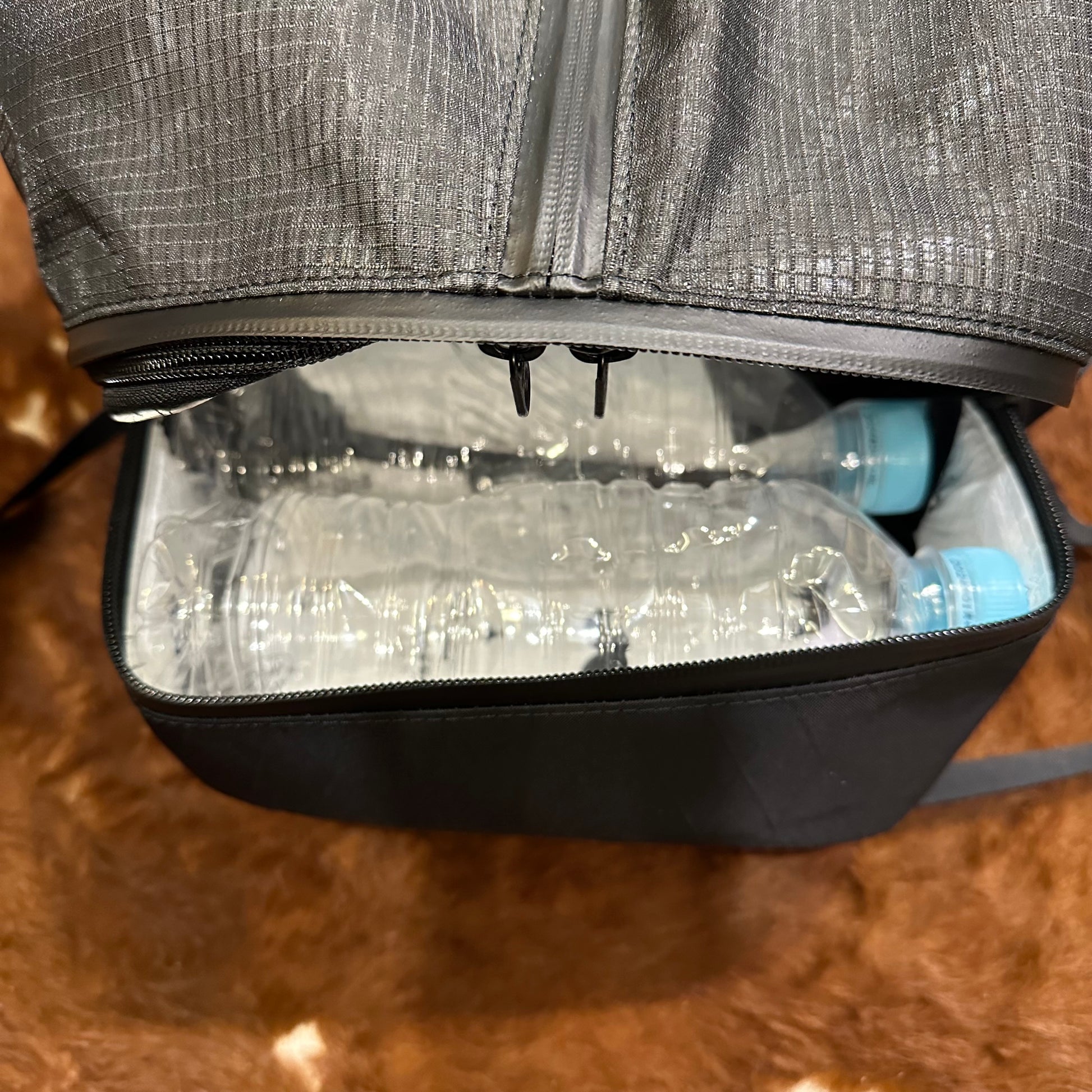 また最大の特徴は底部が2気室となっており保冷シート内蔵により冷えたドリンクや食材をハイク時に携行可能です。
