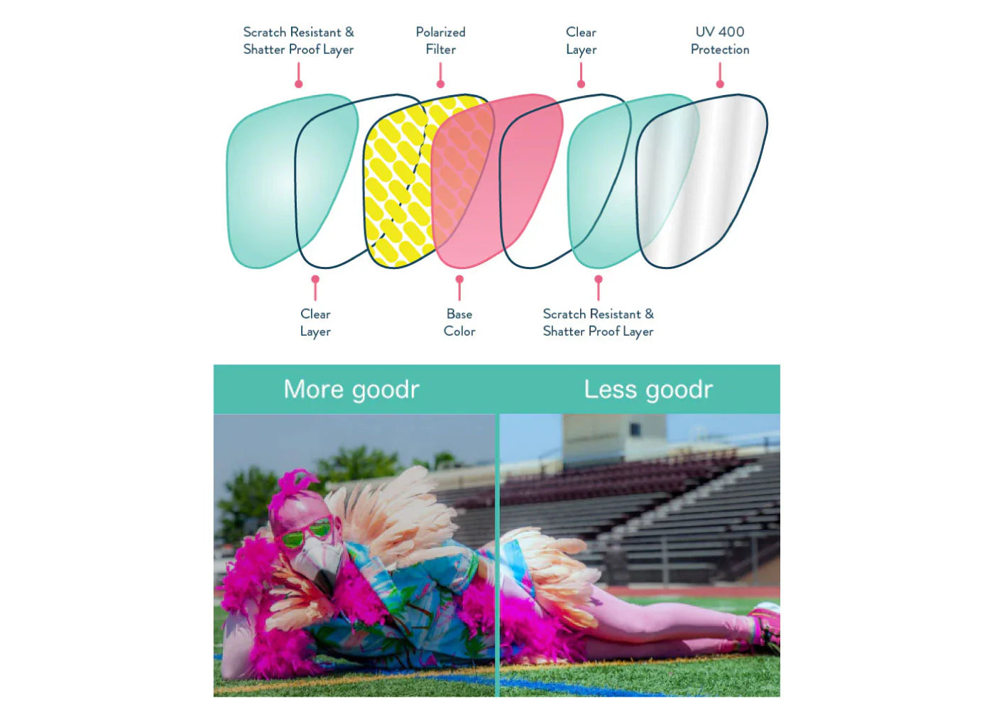7層構造になった偏光レンズは、UV400保護機能を備え有害なUVAおよびUVBの光線を100%ブロック。