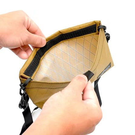 サコッシュ時の使用感も独特です。マジックテープ式の開口部は、中央部分を前後に引くと一気に全開します。