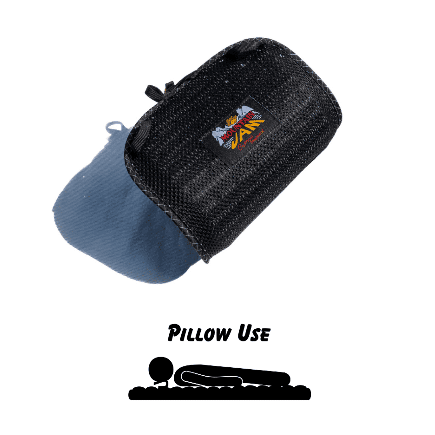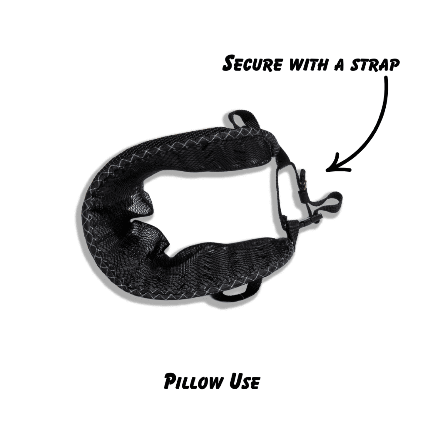 本体中央の上下についているベルトループに付属のストラップをかけ、半分に折るようにテンションをかけると、ピローへ Wavy EVA Foamのクッション性が絶妙で、頭の重みで沈みすぎることがなく、ちょうどいい高さと安定感を生み出してくれます。
