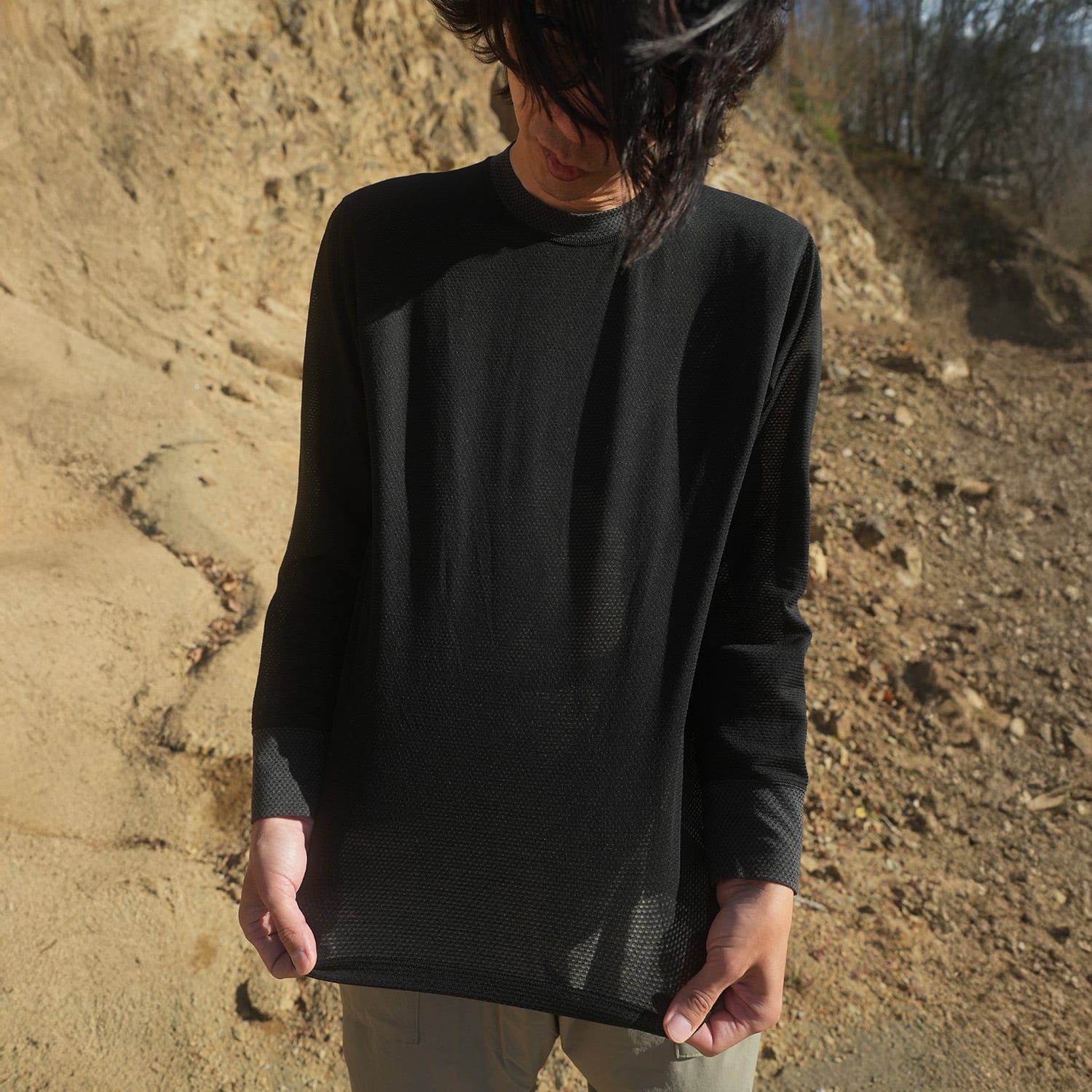 これらを組み合わせた混紡素材をメッシュ構造に仕上げることで「ウールなのに乾くベースレイヤー」が出来上がりました。