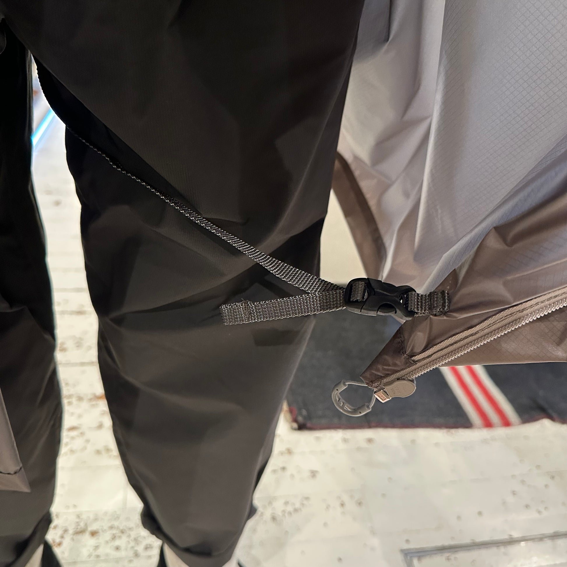 強風時にも対応するためセンターの後ろ裾から前身にベルトを伸ばしバックルで固定できるようにした。