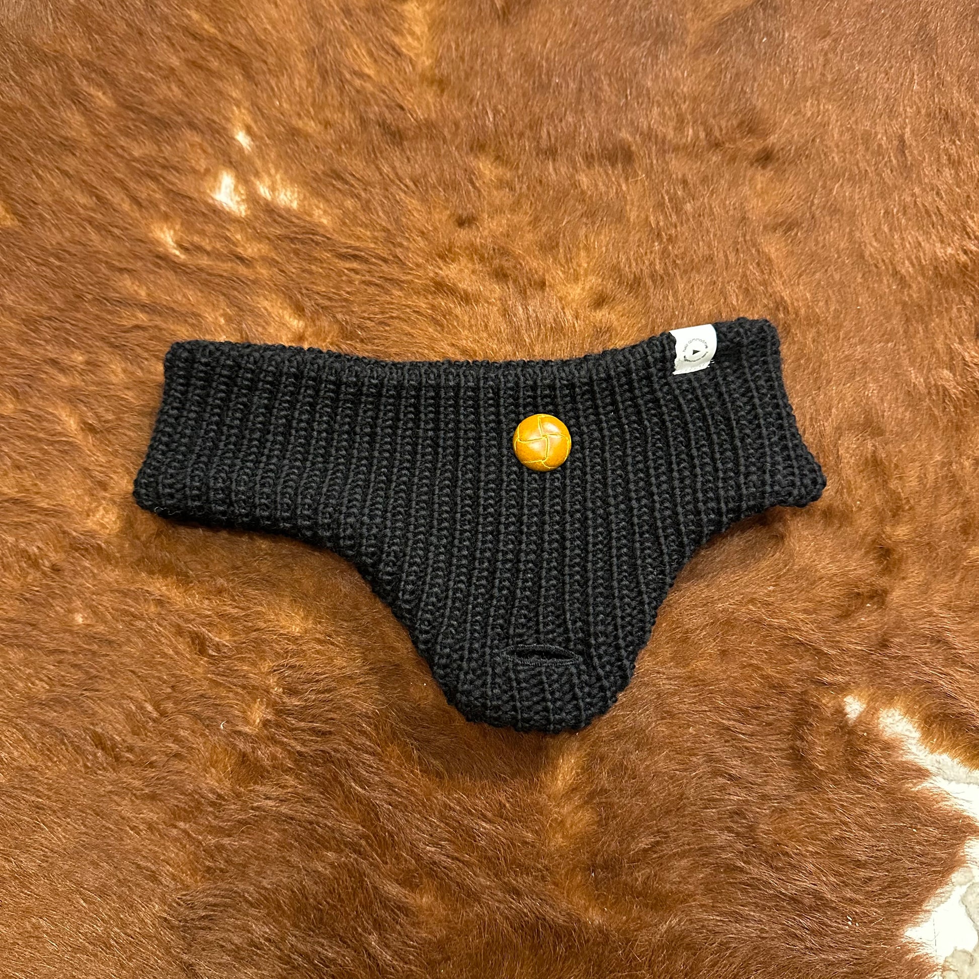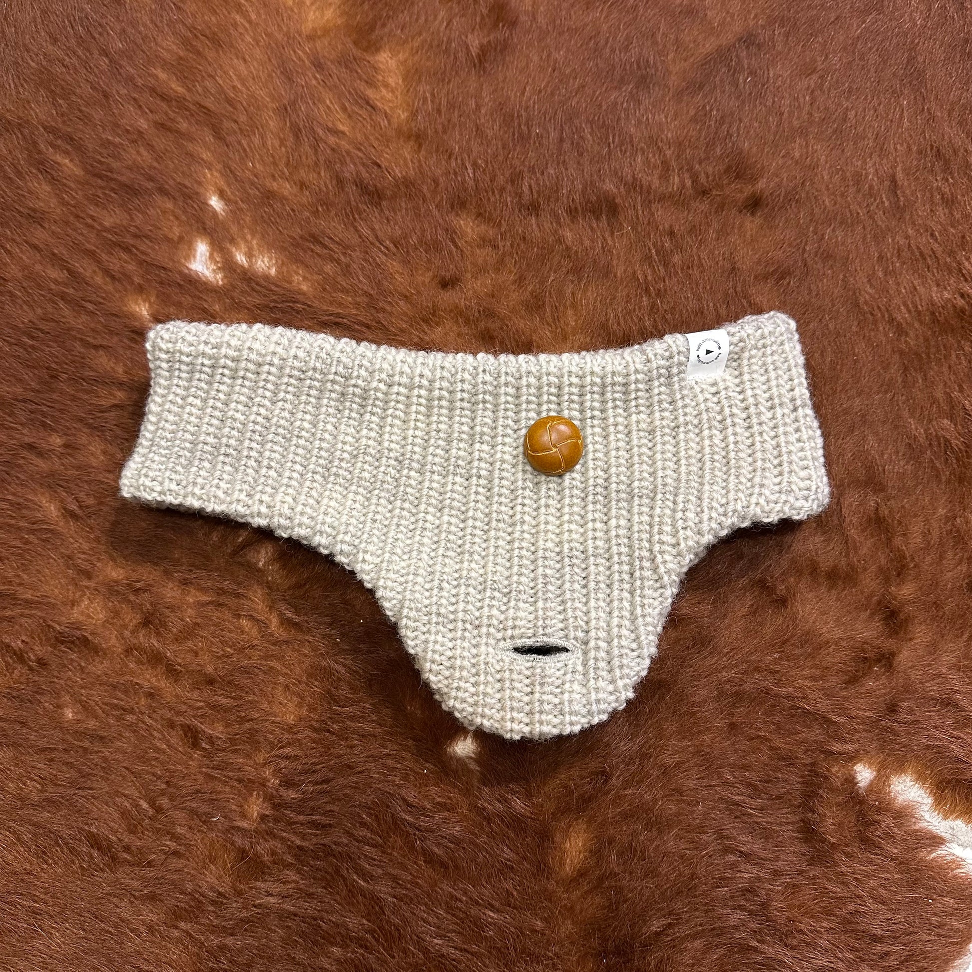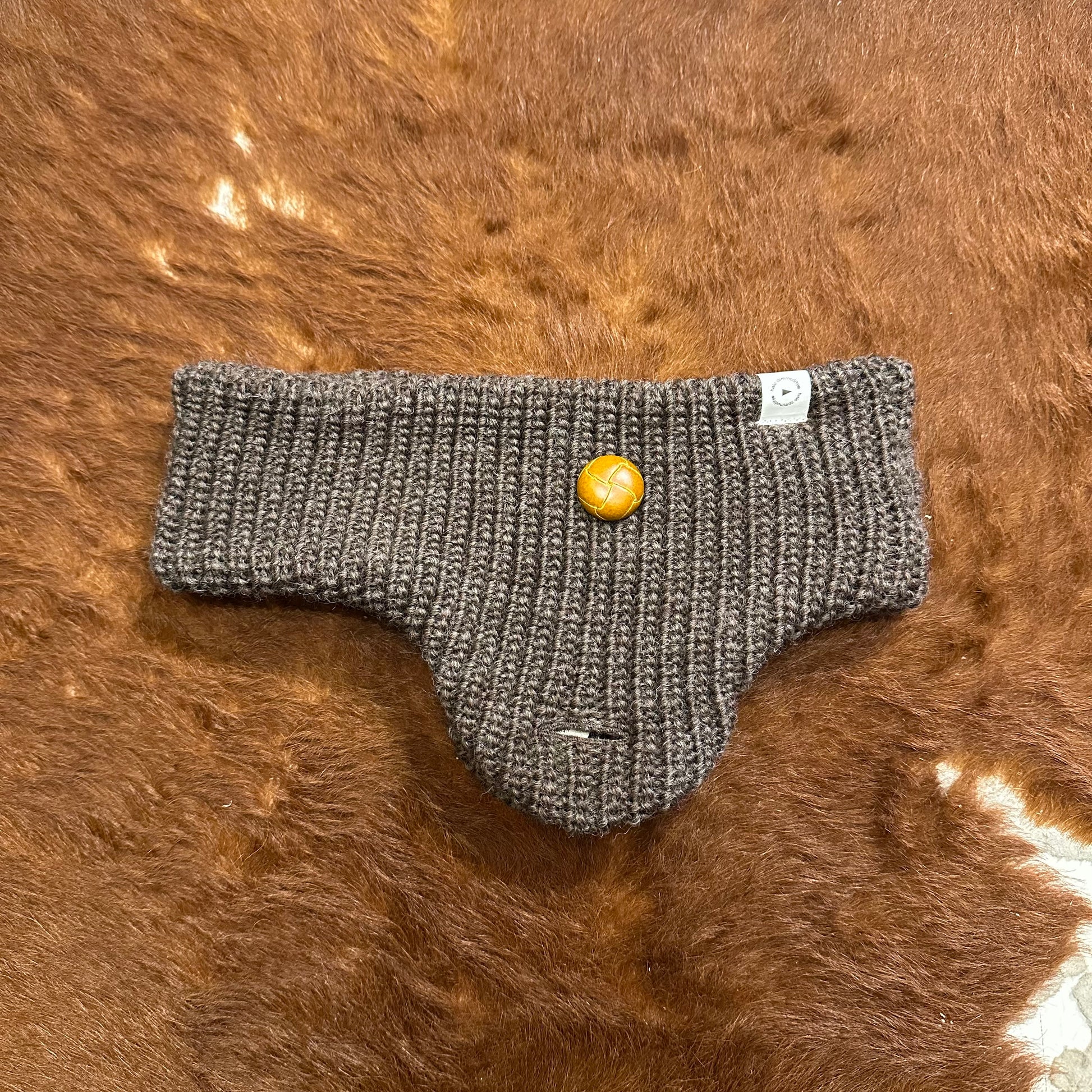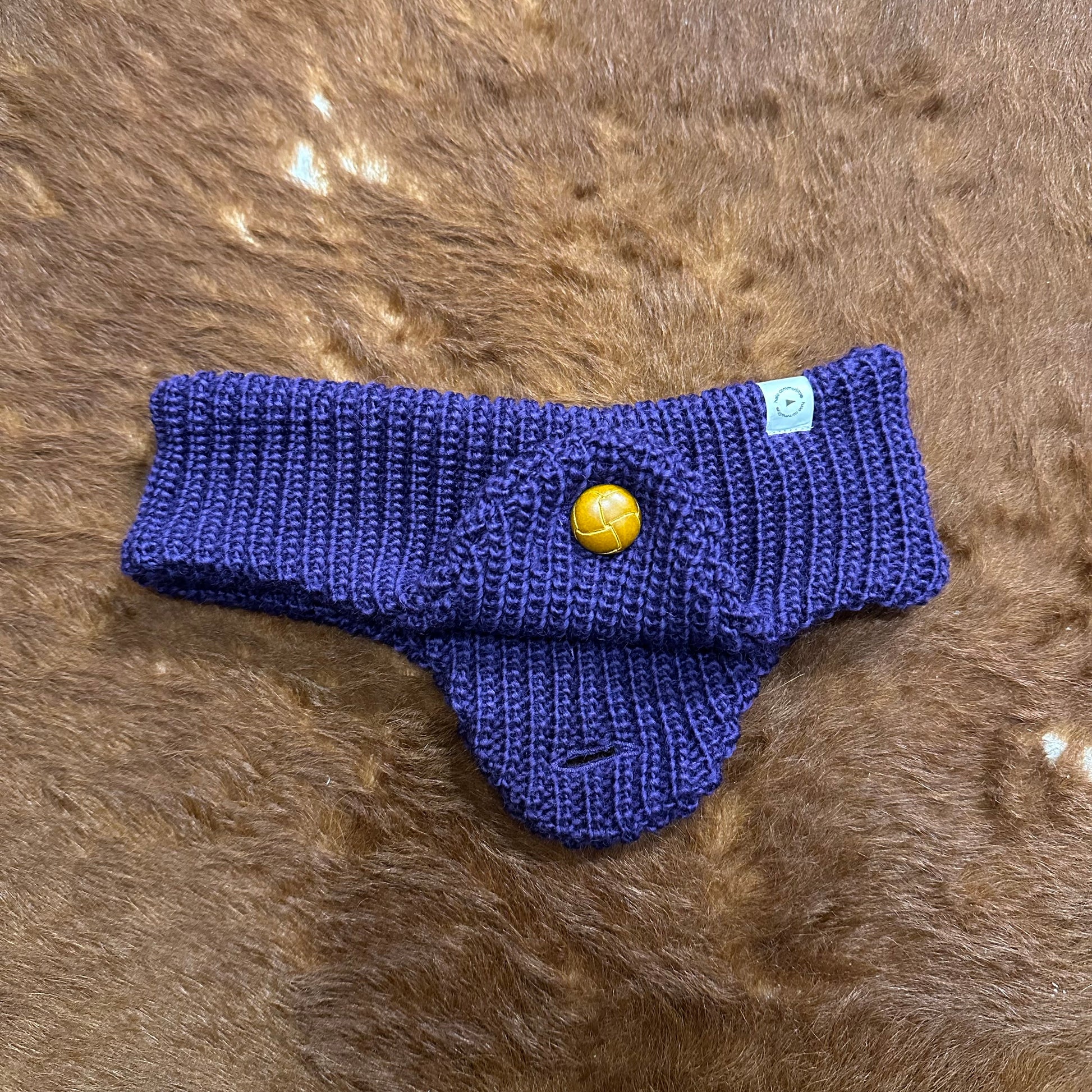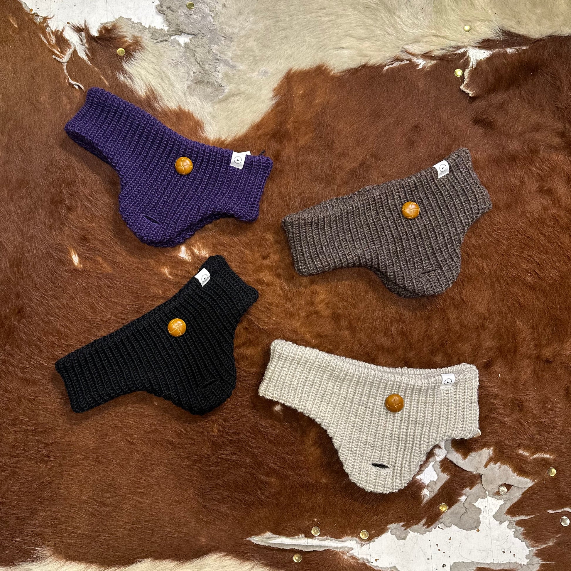 デザインのアクセントにもなっているレザー調のボタンを外せば、耳当てとして使用可能。