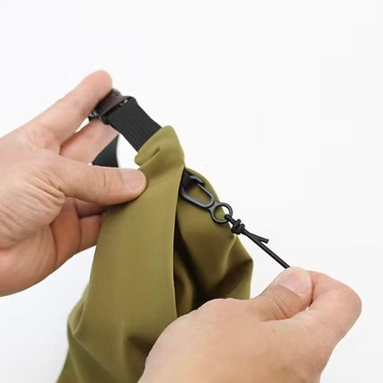 腰に巻き、テンションをかけることで自然と口が閉じます。